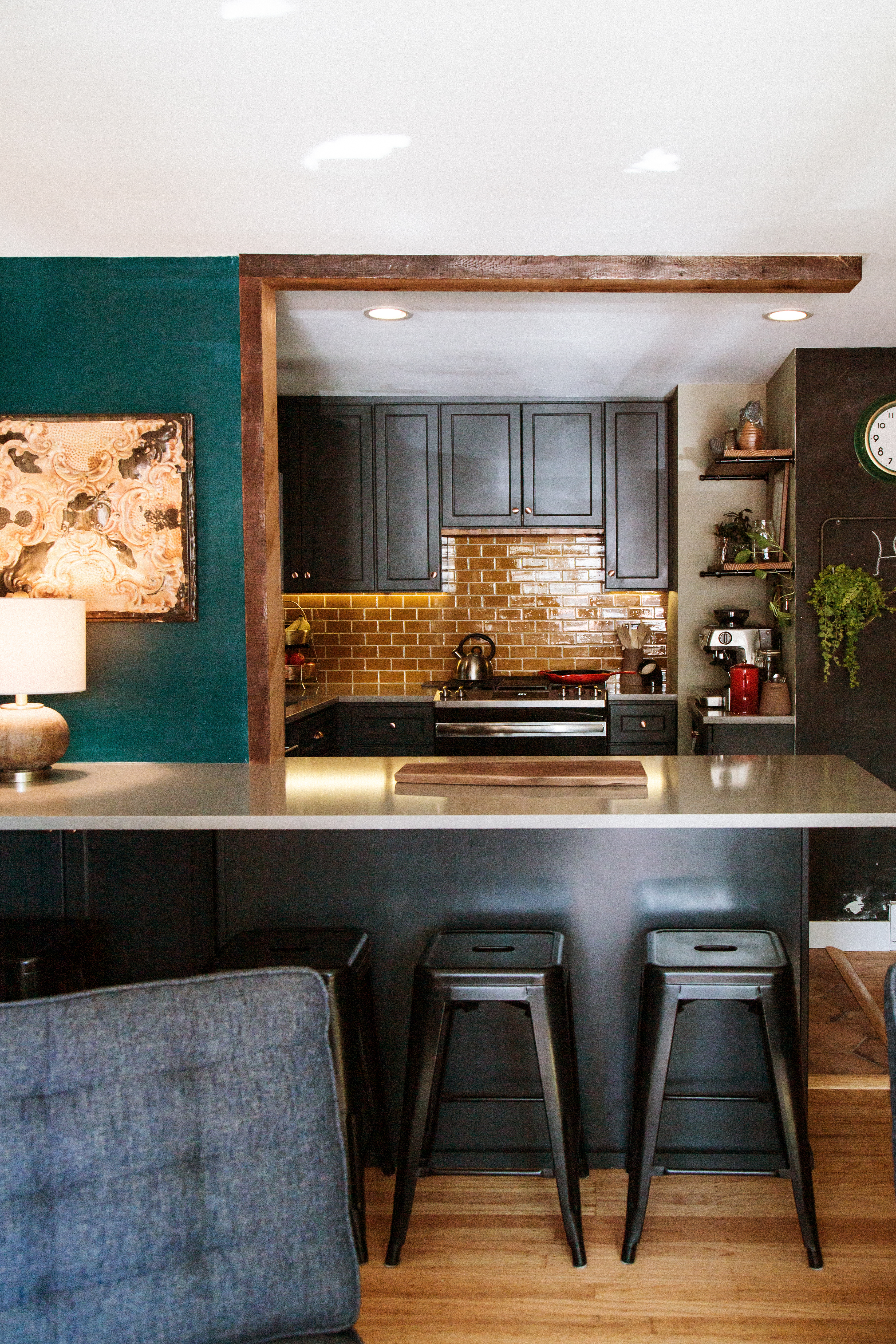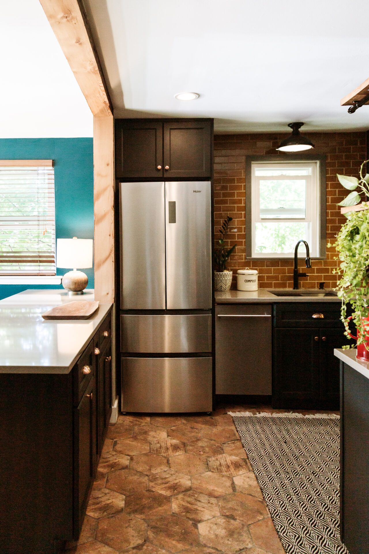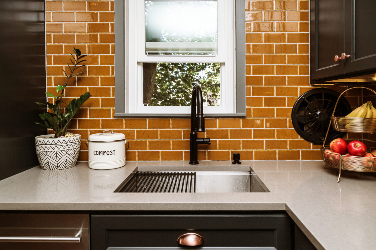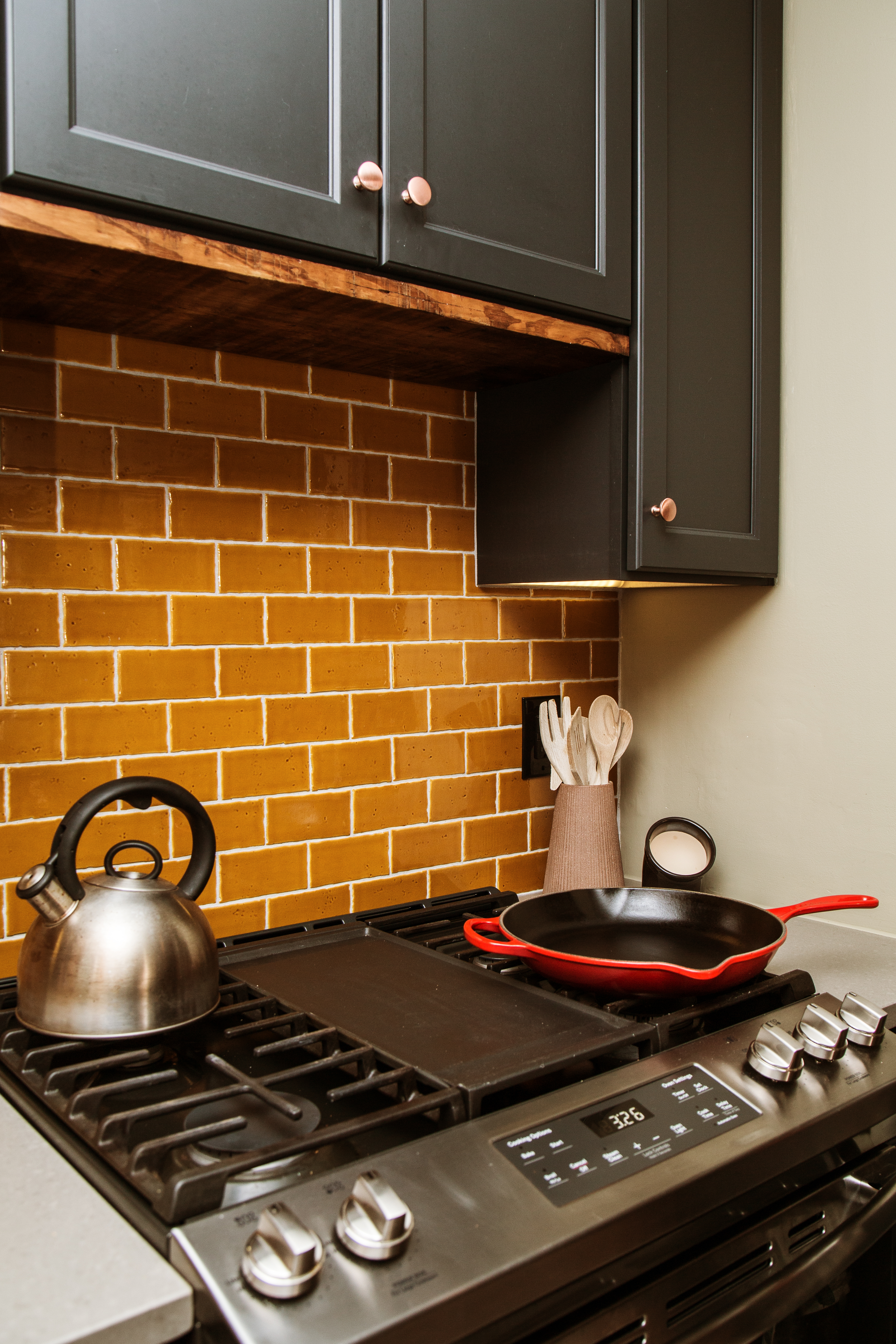 While early ideas explored a brick backsplash, we ultimately landed on a more practical and expressive solution: a saturated marigold subway tile paired with hexagon clay floor tiles. The combination brings warmth, texture, and character—creating a space that feels both vibrant and grounded.