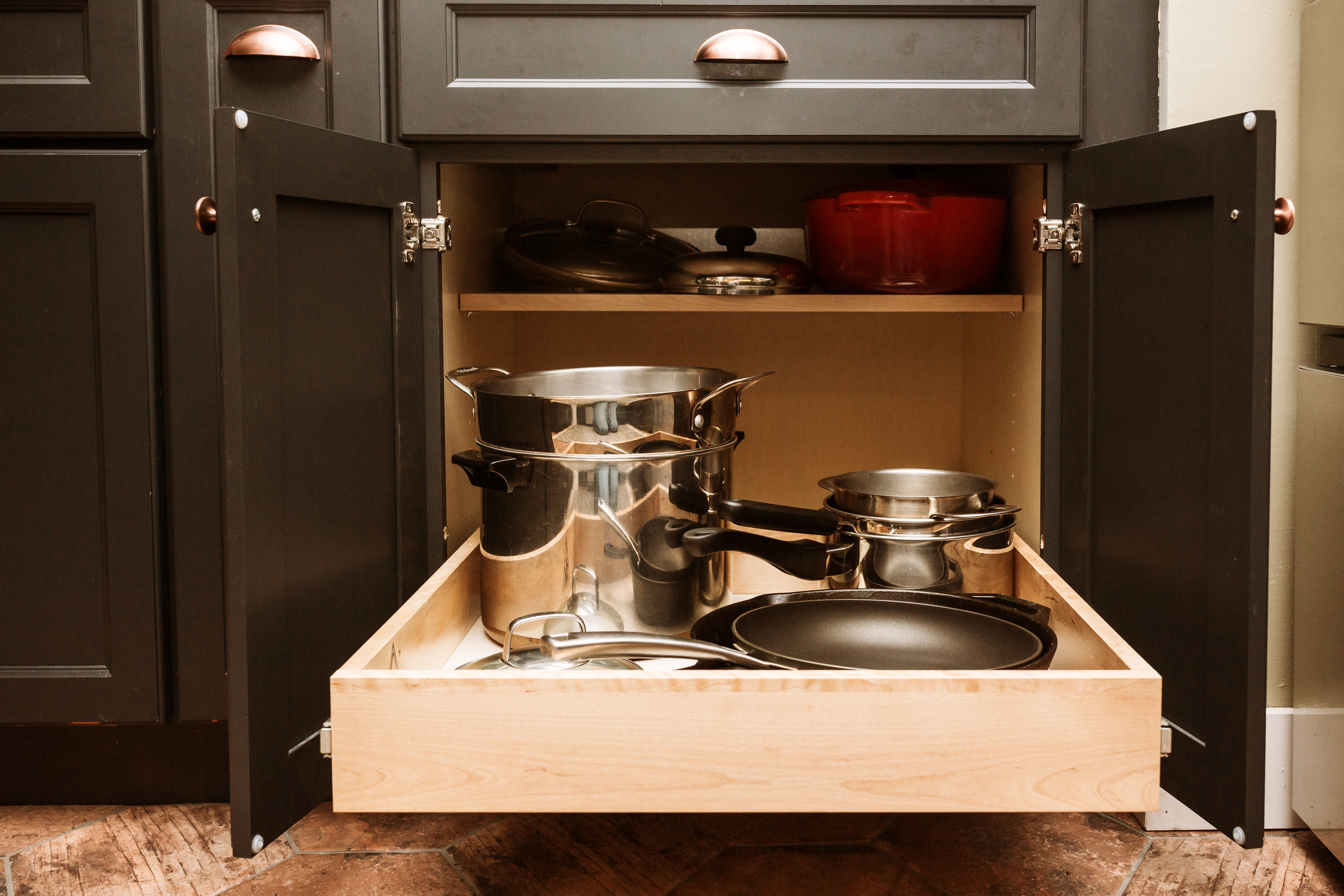 • Pull-out drawers, a built-in trash unit, and a spice rack for efficiency