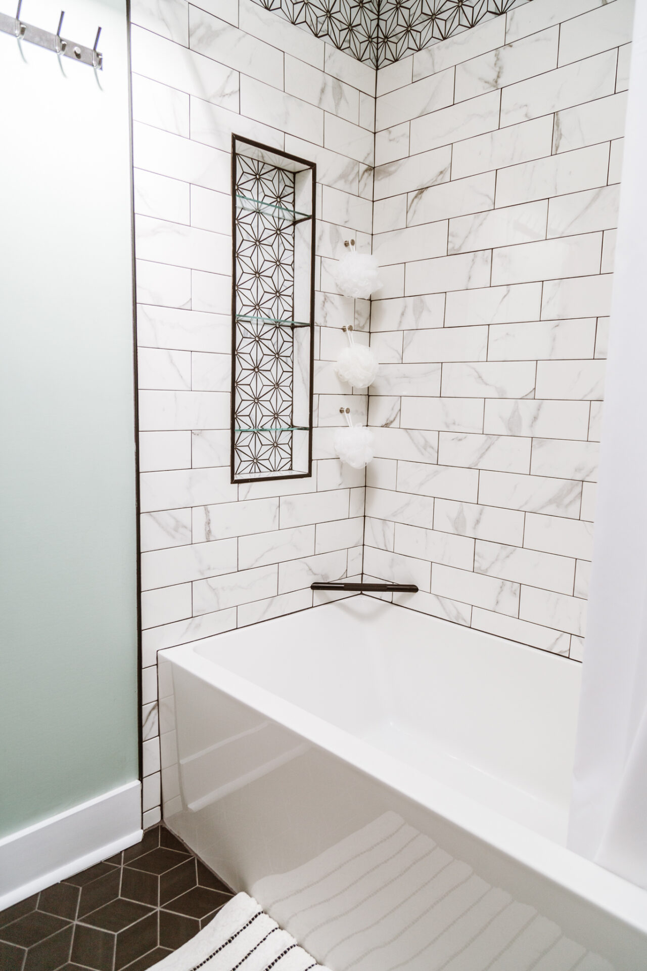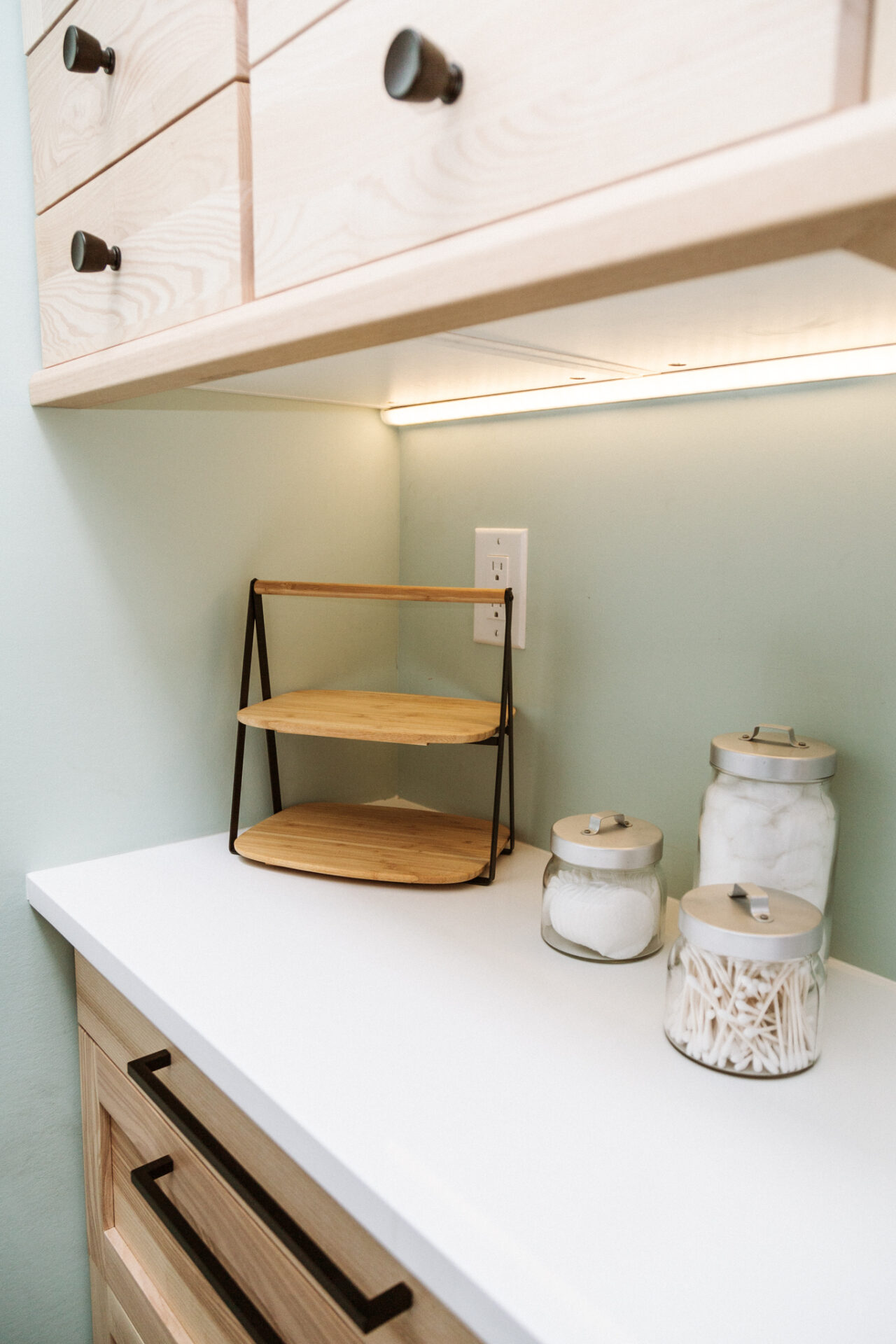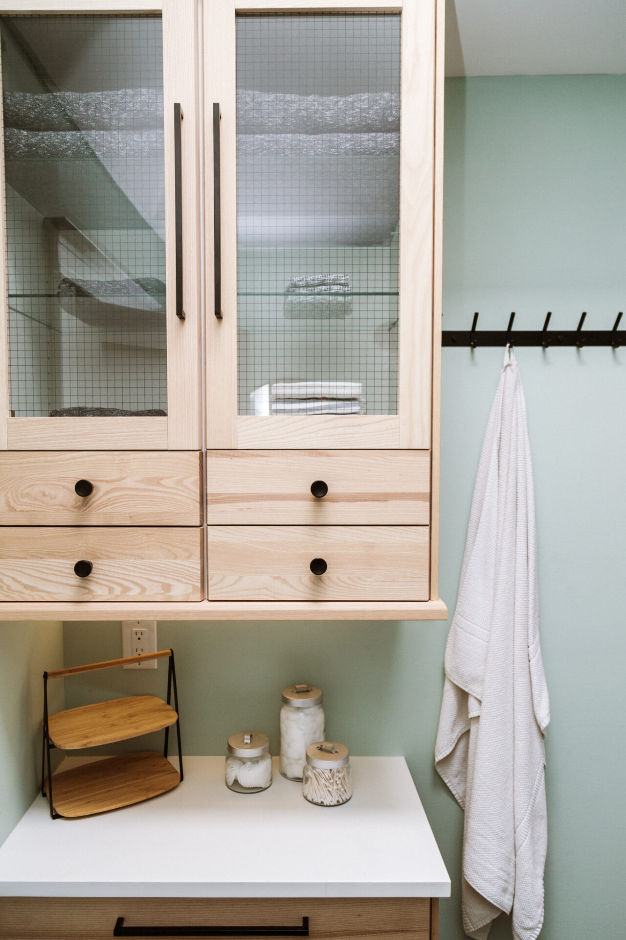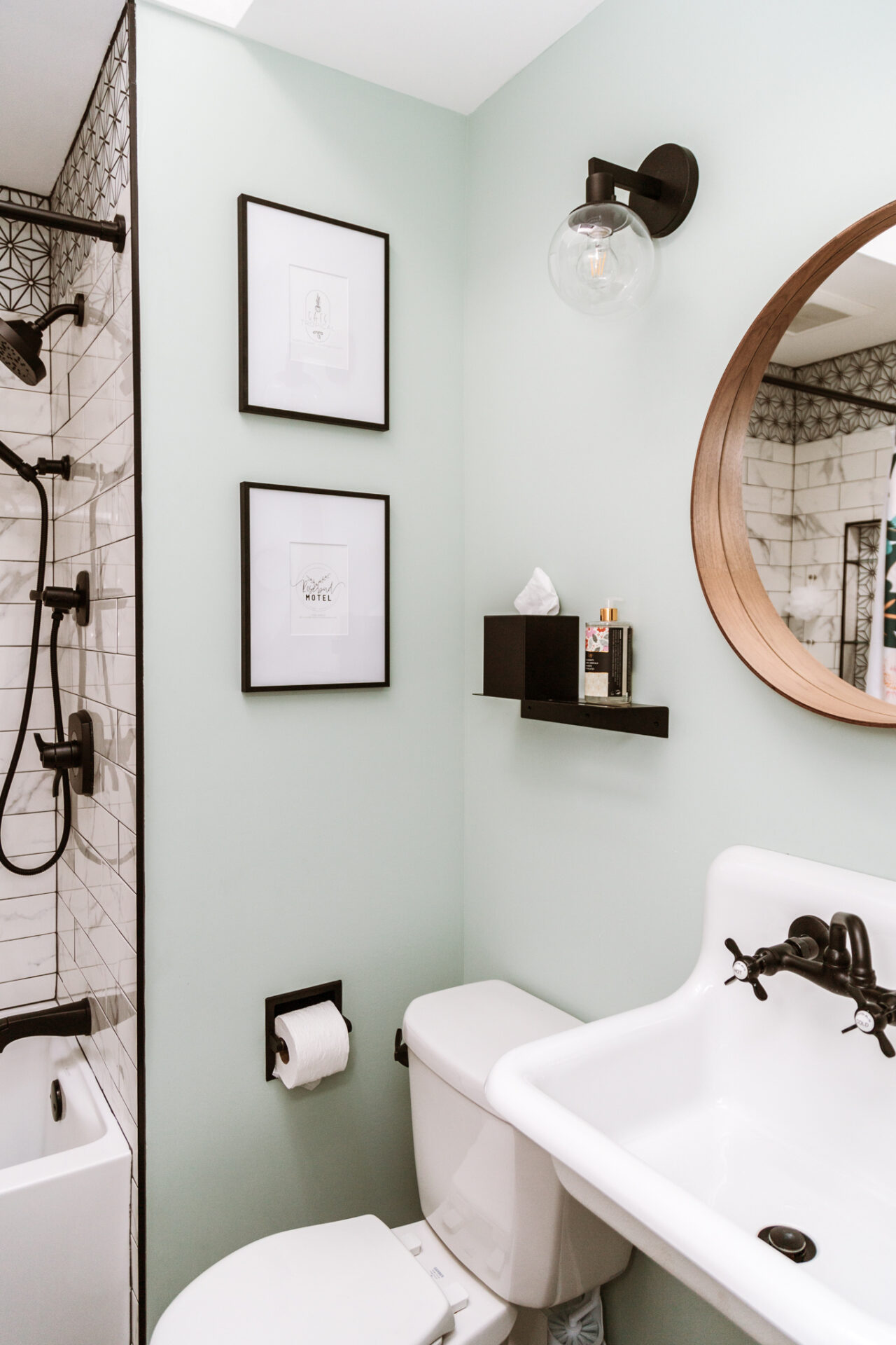 The aesthetic was equally intentional. A light, airy Scandinavian-inspired foundation—soft seafoam tones, light woods, and natural brightness—was paired with darker fixtures and accents to create contrast and depth. This balance served as a thoughtful compromise between the male(s) + female occupants, blending a softer, more tranquil feel with bold, grounded elements that add a sense of structure and sophistication.