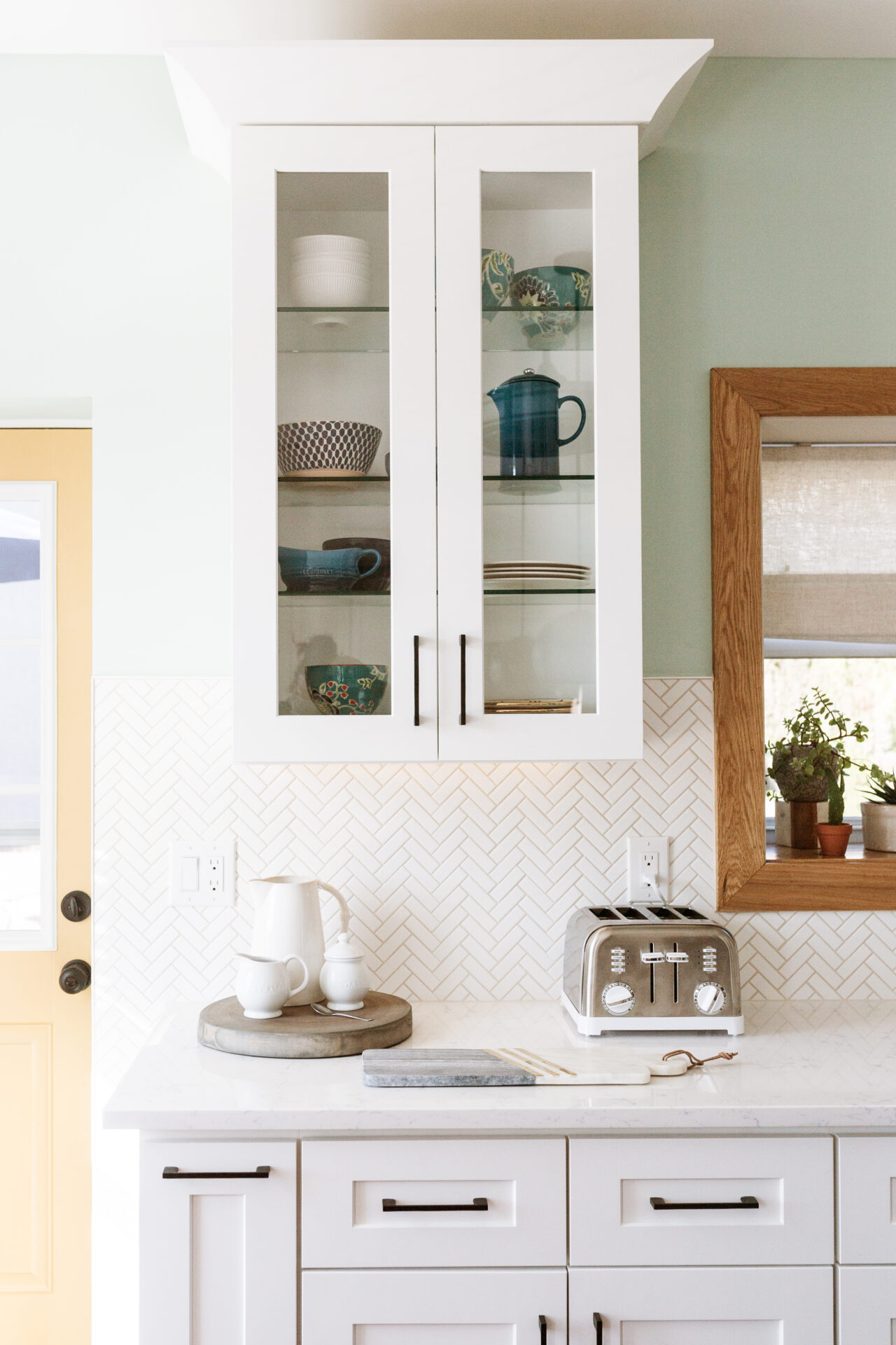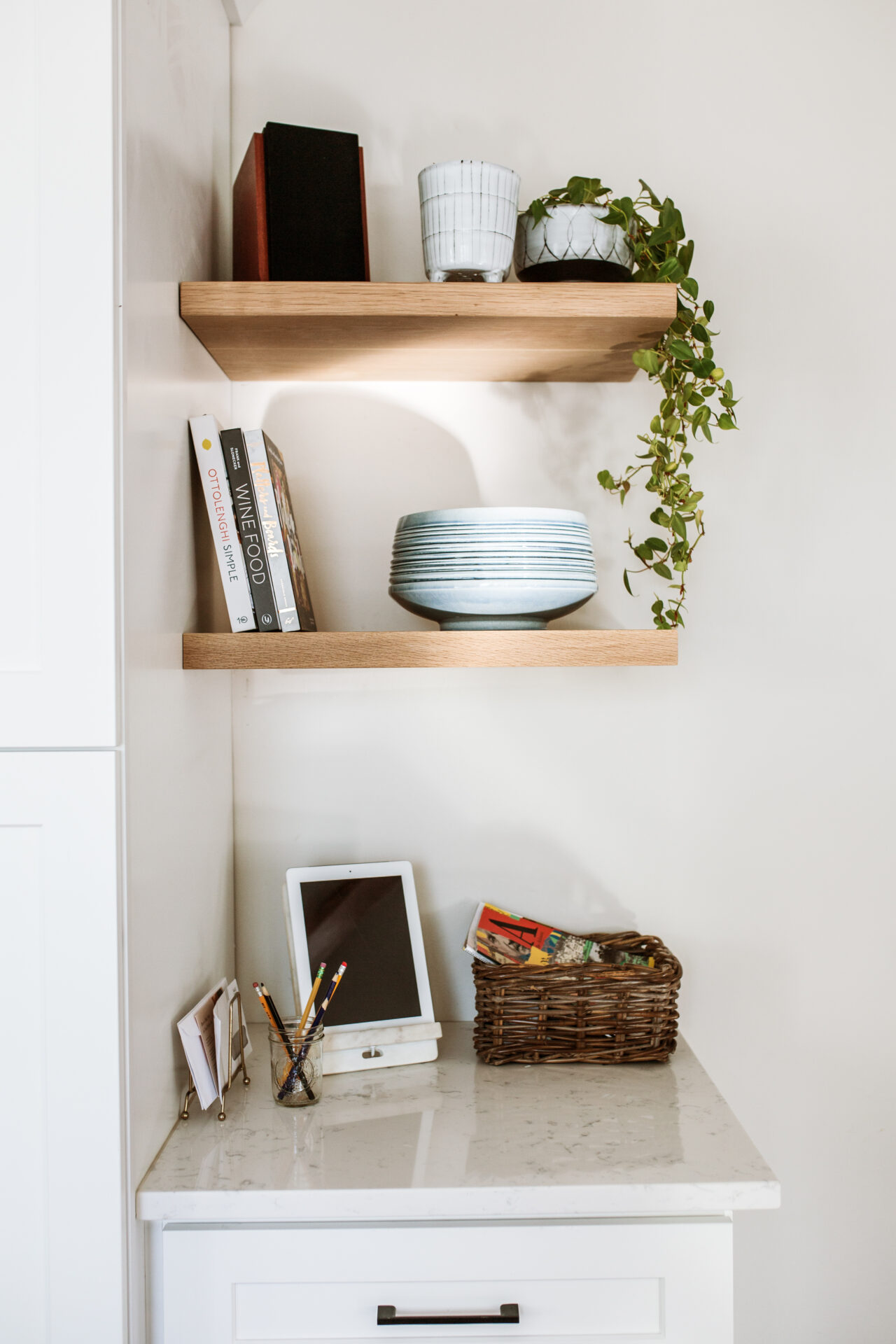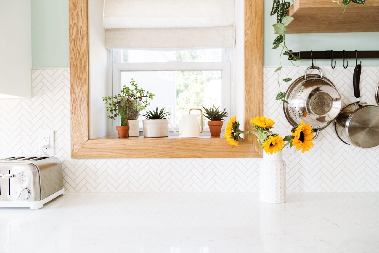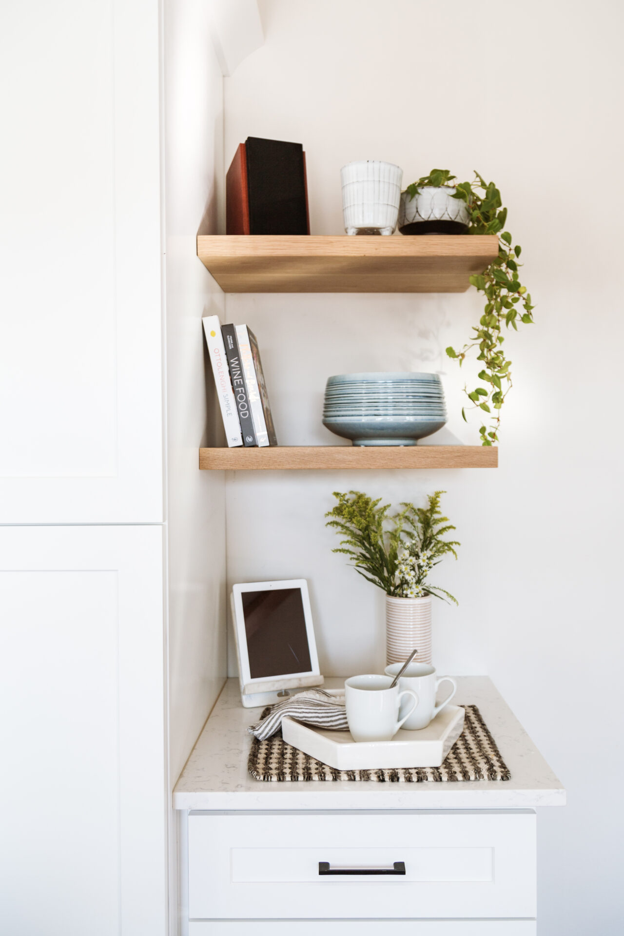 • Minimal open shelving provides both function and warmth—perfect for accessible storage and even growing fresh herbs